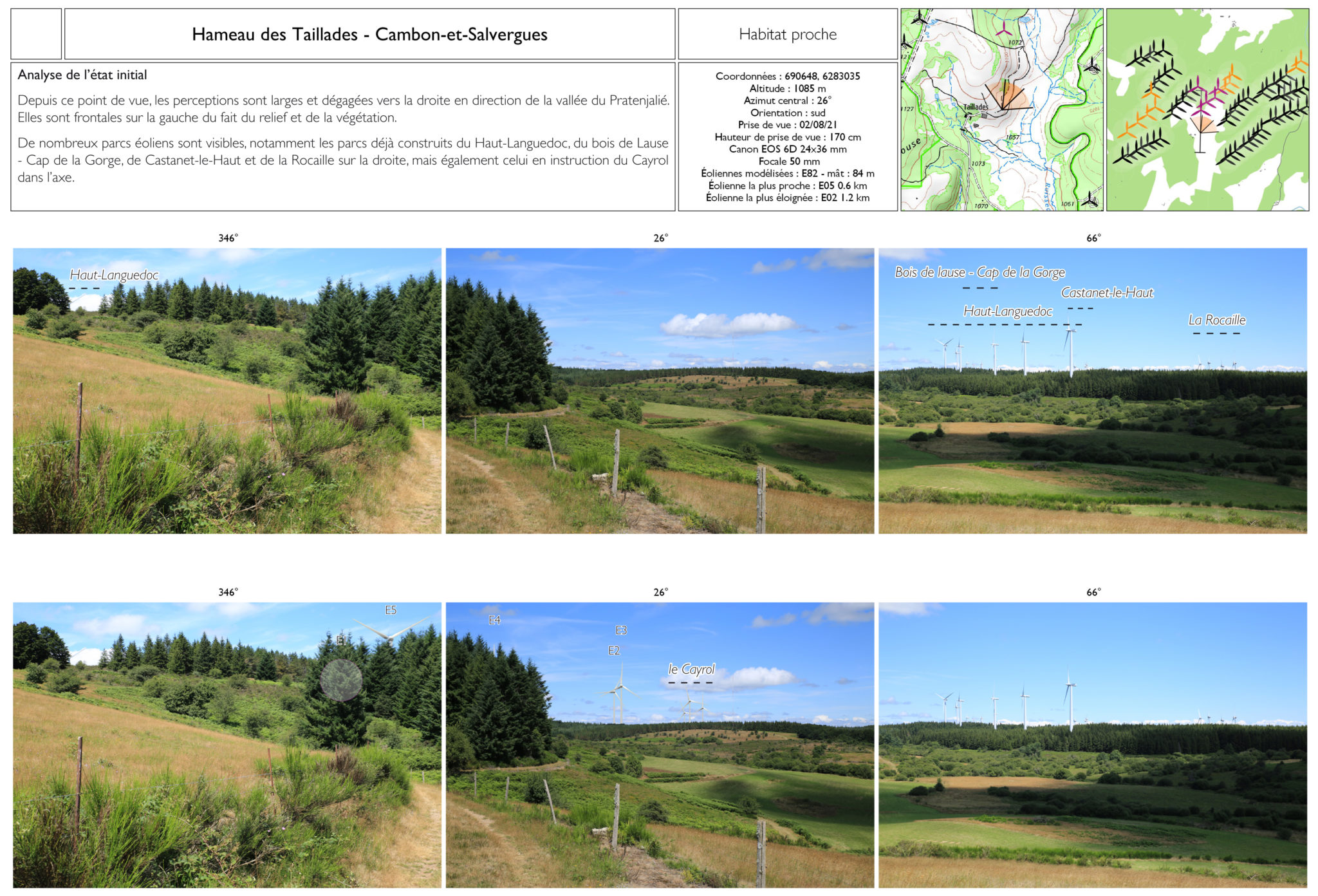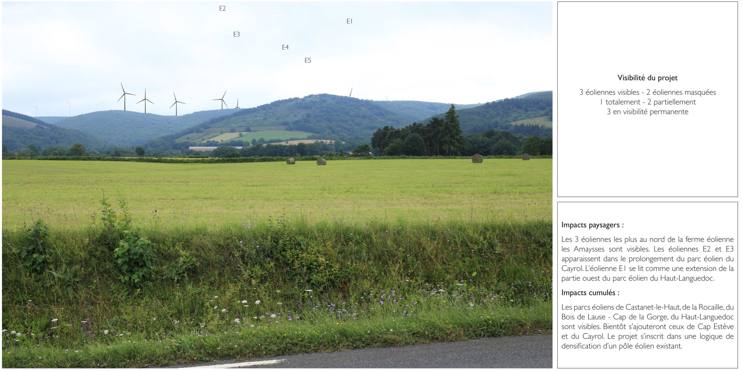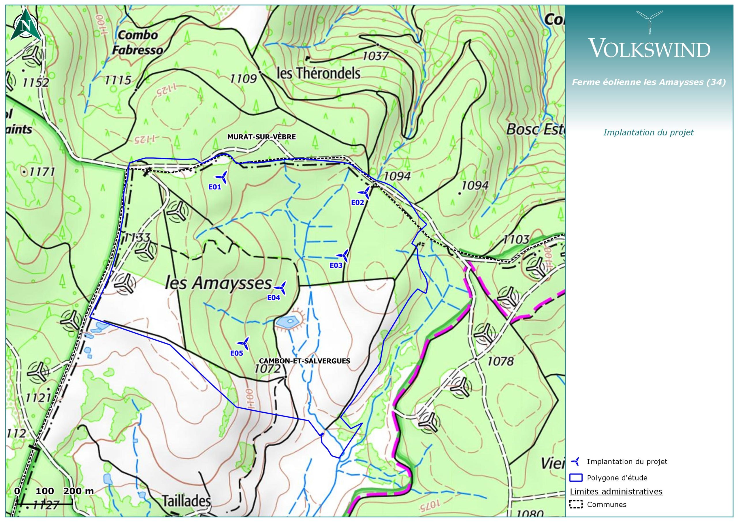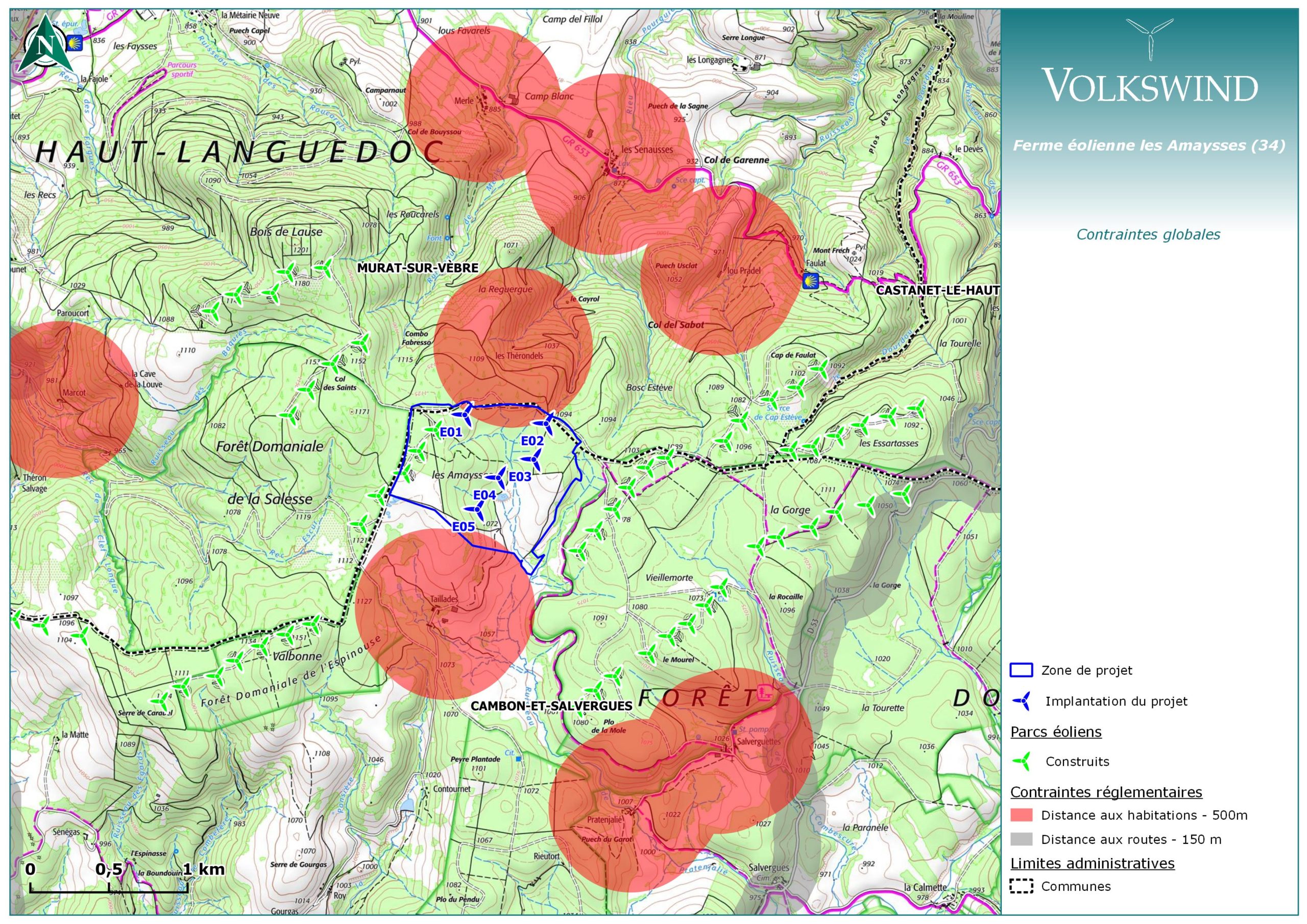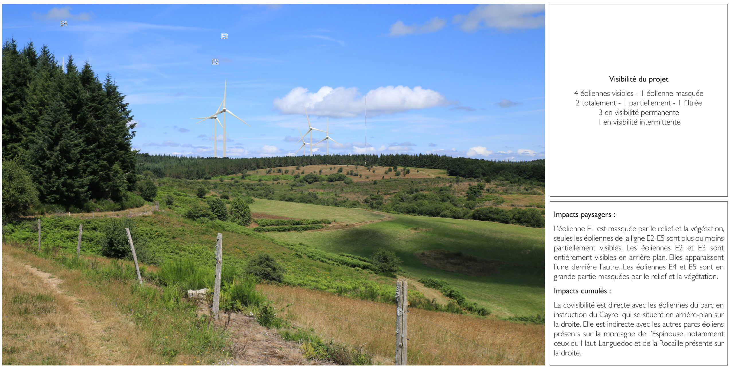 Le parc est composé de cinq machines Enercon E-82 de 3 MW. Il s’intègre dans le pôle éolien de la montagne de l’Espinouse, pôle qu’il vient densifier en complétant les lignes d’implantation des parcs éoliens existants. En effet, l’éolienne E01 s’inscrit dans le prolongement du parc éolien du Haut-Languedoc situé à l’ouest, et la ligne d’éolienne E02-E05 vient s’implanter selon le même axe nord-est / sud-ouest par rapport aux parcs éoliens alentours.